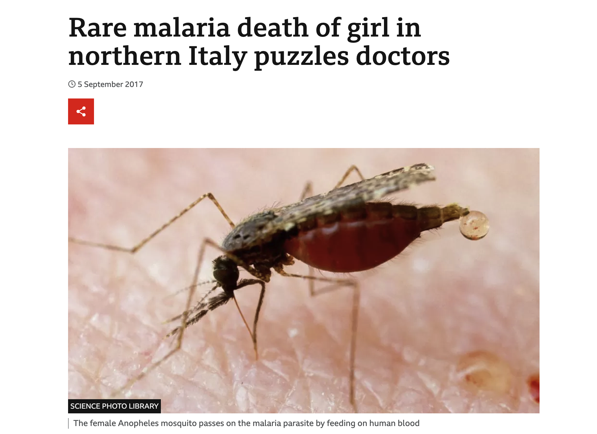 “It’s the first time in my 30-year career that I’ve seen a case of malaria originating in Trentino,” said Dr Claudio Paternoster, an infectious diseases specialist at Trento’s Santa Chiara Hospital. Since the 1950s, Italy has not had a malaria problem because mosquito-infested marshes were drained. There is speculation that Sofia might have caught malaria from one of two children treated for it at the Trento hospital after 15 August. They had caught it in Africa, and recovered.