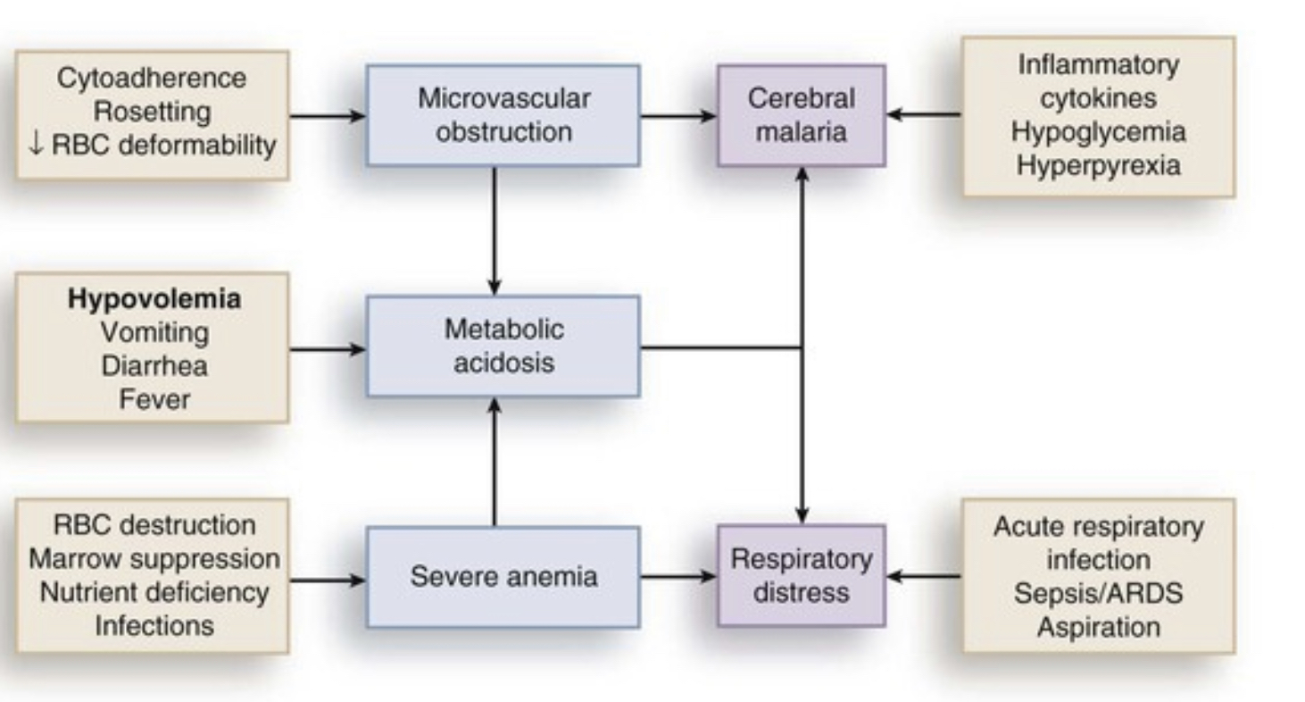 Sequestration- parasitized RBCs: glomerulonephritis, hypoglycaemia, pulmonary edema