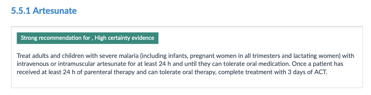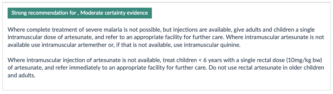 When artesunate not available, artemether is considered as second line therapy followed by quinine (dihyrdochloride)- must be given by slow infusion or IM.