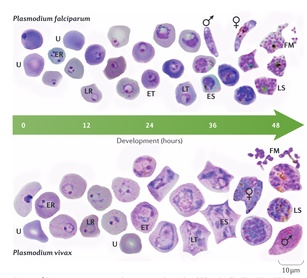 | Plasmodium spp. | Liver stage | Blood cycle and fever peaks | Disease features |