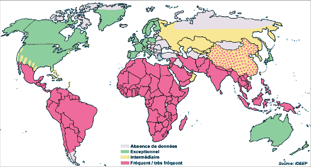 Worldwide, contamination of food and drinking water has maintained E. histolytica infection second only to malaria as a cause of death from parasitic disease. The epidemiology has been greatly informed by the appreciation that Entamoeba dispar, a closely related nonpathogenic species, colonizes between 5% and 25% of persons (Clark1997?; Haque2003?; Diamond1993?).