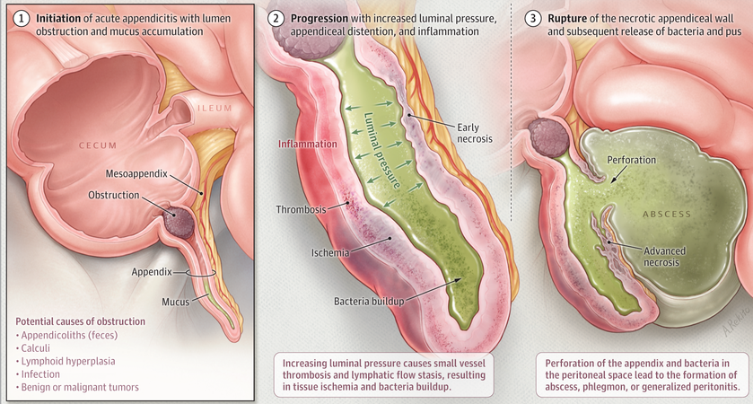 Physical obstruction of the appendiceal lumen by fecaliths or other causes (e.g., foreign bodies, tumor, stricture, or parasites) has classically been thought to be the primary pathogenic mechanism (Wangensteen1978?; Arnbjornsson1983?; Singh2014?). Mucus accumulates within the obstructed lumen, and intraluminal pressure increases, leading to compression of lymphatic and vascular drainage and causing ischemic damage of the mucosa, followed by microbial invasion and inflammation. If left untreated, this may lead to gangrene and eventual perforation. The pathologic hallmark of acute appendicitis is the presence of polymorphonuclear cells within the appendiceal wall, accompanied by edema and vascular congestion.