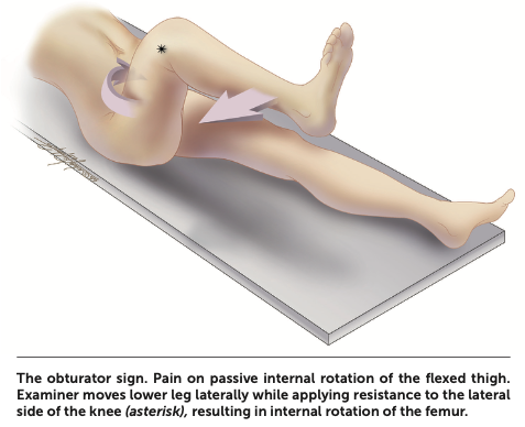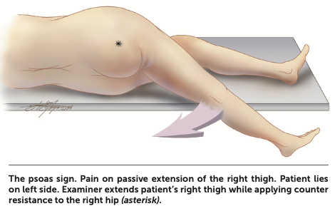 Guarding is usually seen on examination. Rebound tenderness in the right lower quadrant with palpation of the left lower quadrant, known as the Rovsing sign, may be elicited (Figure 4). Other maneuvers include pain with active extension of the right hip (the psoas sign), and pain with internal rotation of the right hip (the obturator sign) (Figure 5). High fever or a sudden reduction in pain suggests perforation, whereas abdominal rigidity suggests diffuse peritonitis.