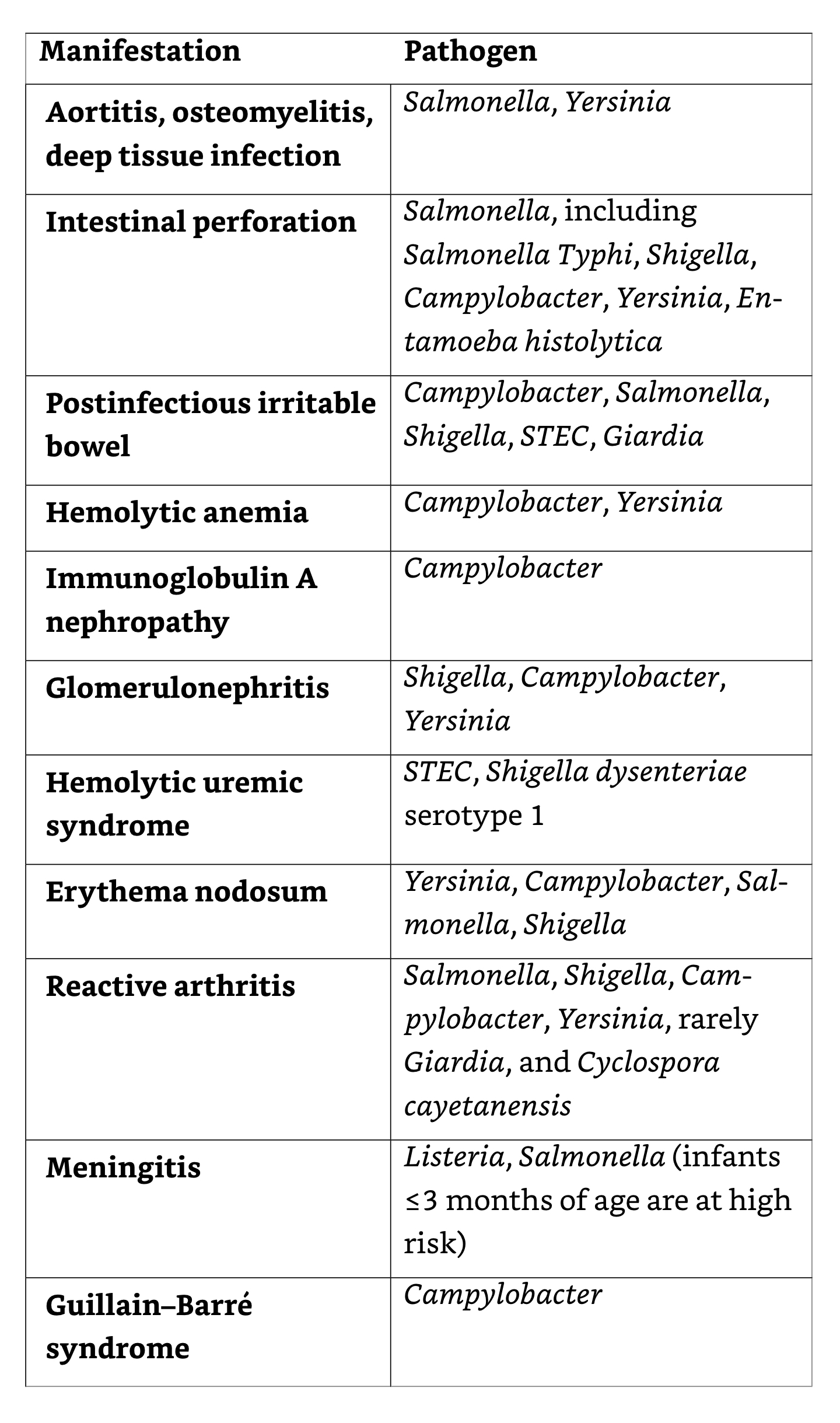| Inflammatory diarrhea | Campylobacter spp | 2 to 5 days | Poultry, unpasteurized milk, water |