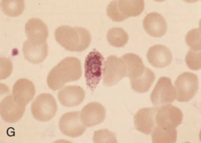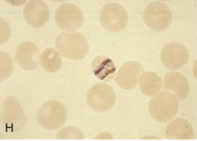 | | Characteristic band form trophozoite of P. malariae containing intracellular pigment hemozoin |